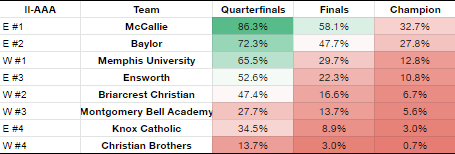 Favorites (20% or higher): South Pittsburg (35.1% to win 1A title), Lake County (28.4%), Huntingdon (28.3%)