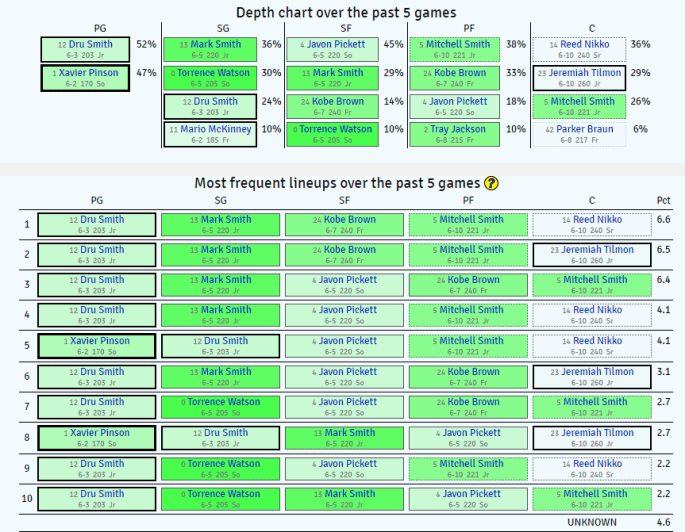 - Torvik’s suggested best lineup: Pinson, Dru Smith, Mark Smith, Javon Pickett, Tilmon. Predictably, said lineup has gotten about five minutes of action over the last five games.