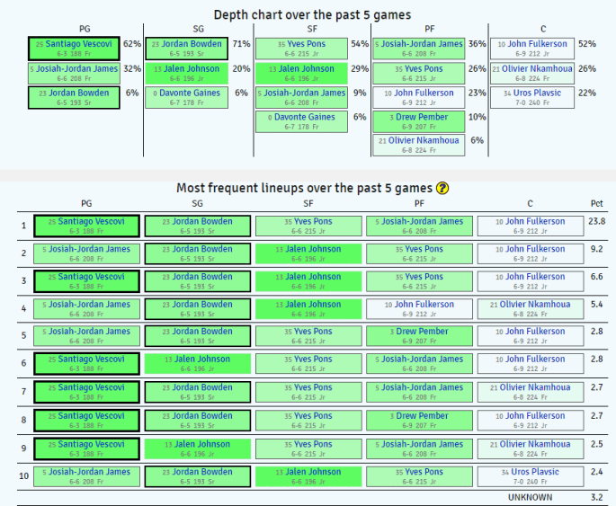 - Vescovi, Bowden, JJJ, Pons, Fulkerson, not sure if that’ll change at all anytime soon. Only replacement I could imagine would be Jalen Johnson over JJJ, but that shouldn’t happen.