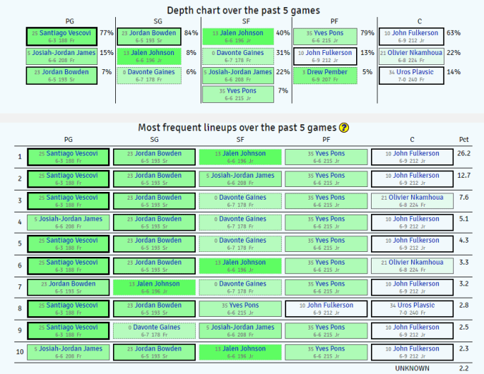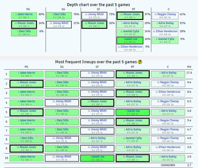 - Rotation looks to be those main five plus Desi Sills as the sixth man. Reggie Chaney has somehow fallen out of the rotation entirely, gathering just 10 minutes in his last two games. You’ll see nine players, but only six of them look to be getting any real run.