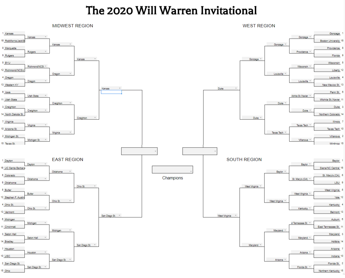 Here’s how our Will Warren Invitational Bracket looks heading into the Final Four, now being held at – and we’re calling to make sure this is correct – Fox Bros BBQ: