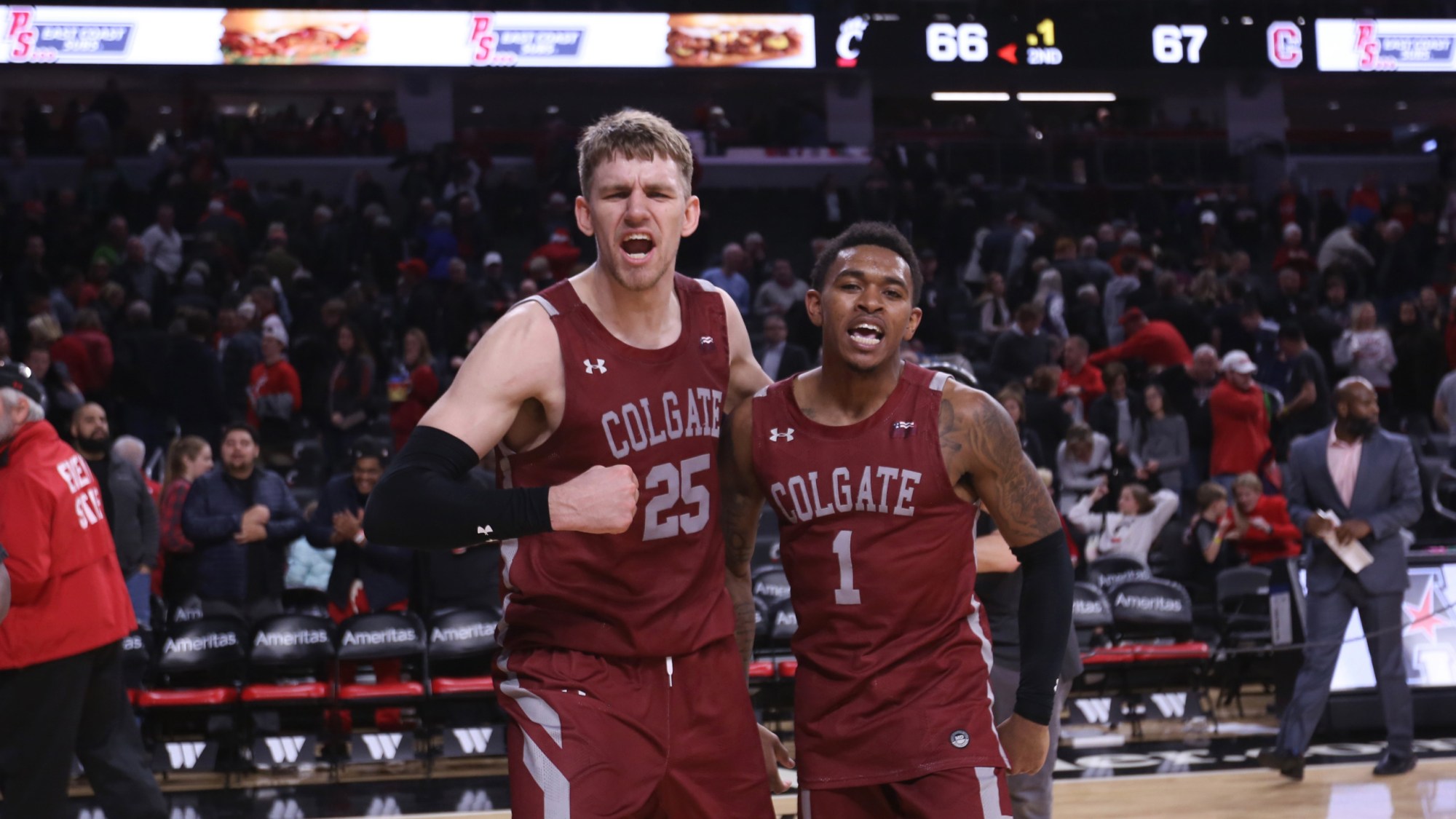 ML on the win: “It’s a huge win. I think that all young people grow up wanting to play on the biggest of stages against the best of teams. When you do end up getting to a place like Colgate, you end up circling those games. We play Syracuse every year, last year we played at Auburn and Clemson, and then Cincinnati this year. To go in there and hold your own is great, but to get over the hump, that’s something the guys wanted to do. The players wanted to prove that not only can they be in those games, like Tennessee in the NCAA Tournament, but find a way to win.”