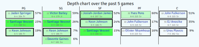 Mark Smith vs. four different players. I expect all of Josiah-Jordan James, Keon Johnson, Jaden Springer, and Victor Bailey to get run in this matchup. Missouri’s offense, after adjusting for luck, has been nearly 15 points better per 100 possessions with Smith on than off. This is due to the Tigers taking 13% more threes and 13.5% fewer mid-range twos when he’s on. Tennessee’s got to limit his impact from three as much as possible.