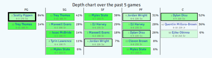- Jerry Stackhouse has run out six different starting lineups in nine games. Amazingly, he’s one of the few coaches I’ve seen to actually revert to his first starting lineup in a stretch like this. So: Pippen, Evans, Harvey, Disu, Millora-Brown.