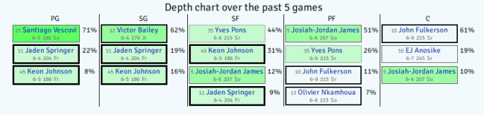 - Well, Tennessee’s run out three different starting lineups in the last three games, but the most recent starting lineup outscored Texas A&M by 11 points in 14 minutes. So: Vescovi, Springer, James, Pons, Fulkerson.