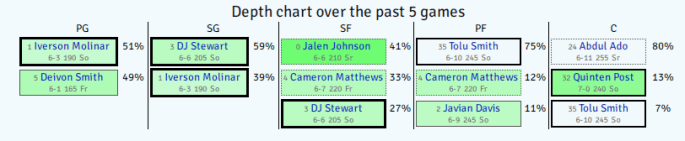 - Howland has tossed out the same starting lineup for ten straight games: Molinar, Stewart, Jalen Johnson, Tolu Smith, Ado.