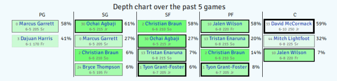 - Something interesting to watch: Bill Self has started experimenting some with Jalen Wilson at center, and on the whole, David McCormack has played just 23 minutes per game across the last five fixtures. Mitch Lightfoot is gaining on him rapidly and is a somewhat better rim protector, though he commits 6.5 fouls per 40.