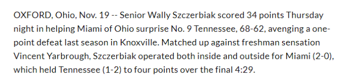 Well, southwest, as the game was played in New Mexico, but whatever. Tennessee lost to Arizona (featuring Jason Terry) 73-72 after getting two shots blocked in the final 10 seconds. That’s a fairly defensible loss! Disappointing, but defensible; Arizona would go on to be a 4 seed in this season’s NCAA Tournament. A couple of snoozers followed this, which led into Tennessee traveling to Miami (Ohio) on a Thursday in November for…reasons. The RedHawks had Wally Szczerbiak, they were only one-point underdogs, and what happened next was like a trainwreck everyone today would’ve seen coming.
