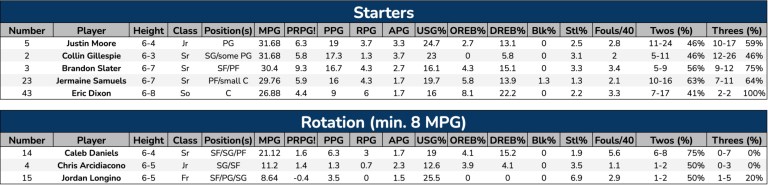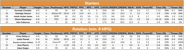 Metric explanations: MPG is minutes per game. PPG/RPG/APG/Fouls/Twos/Threes are what you’d guess. USG% is the percentage of possessions a player uses on the court. OREB%/DREB% are your available rebounds usurped. Finally, PRPG! is Bart Torvik’s Points Over Replacement metric; the higher the better. If you’re on mobile, zoom in; if on desktop, right click -> Open Image in New Tab.