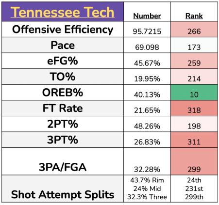 As covered, Tennessee Tech does a poor job of forcing bad shots, and Tennessee will get more than enough looks at the rim and from three. On the former, Tennessee was fabulous at applying pressure in the paint in the North Carolina game via the handling skills of Kennedy Chandler and Zakai Zeigler and even Justin Powell. Tennessee got a shockingly high amount of points at the rim against UNC in part because these guys handled the ball well and forced UNC to commit two to a ball-handler, which opened a cutter for an easy two. Tennessee can continue working on that in a game against a team ranking out as a poor interior defense that’s suffered from foul issues this season.