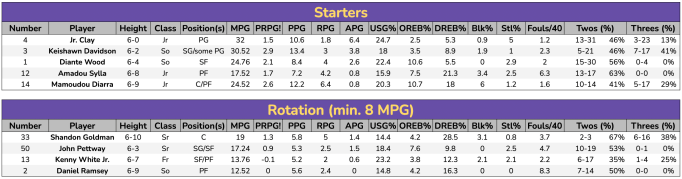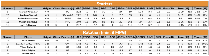 Metric explanations: MPG is minutes per game. PPG/RPG/APG/Fouls/Twos/Threes are what you’d guess. USG% is the percentage of possessions a player uses on the court. OREB%/DREB% are your available rebounds usurped. Finally, PRPG! is Bart Torvik’s Points Over Replacement metric; the higher the better. If you’re on mobile, zoom in; if on desktop, right click -> Open Image in New Tab.