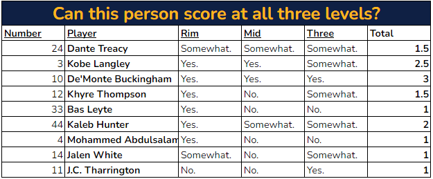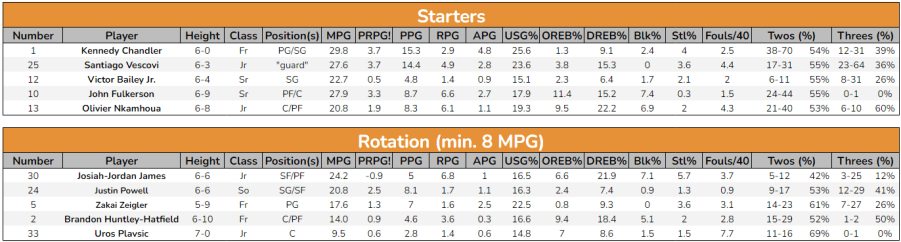Metric explanations: MPG is minutes per game. PPG/RPG/APG/Fouls/Twos/Threes are what you’d guess. USG% is the percentage of possessions a player uses on the court. OREB%/DREB% are your available rebounds usurped. Finally, PRPG! is Bart Torvik’s Points Over Replacement metric; the higher the better. If you’re on mobile, zoom in; if on desktop, right click -> Open Image in New Tab.