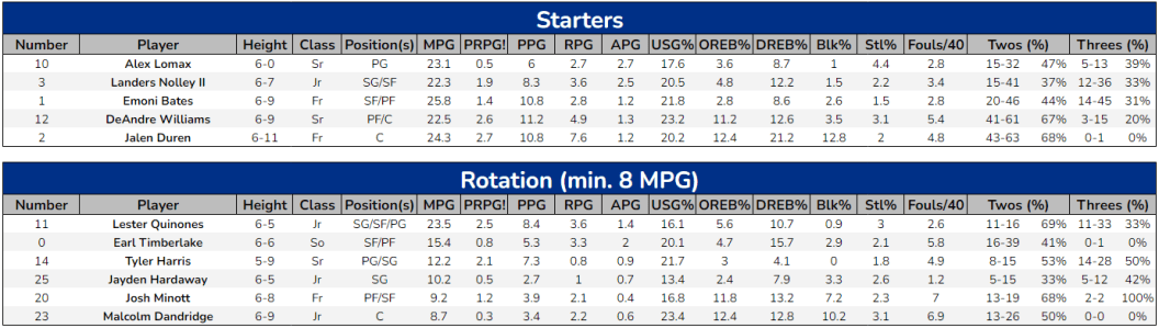 Kennedy Chandler vs. Alex Lomax. The story for two years has been that, if Penny Hardaway really wanted Kennedy Chandler, he would’ve recruited him harder. Instead, Penny has had to hand the reins to Lomax, a senior who has an utterly absurd TO% of 36.8% and is a career 30% 3PT% shooter. Lomax is a fine defender, but Chandler can use his own strength to get around him. To be frank, if Penny doesn’t let Tyler Harris run point for the majority of the game, he’s lost it before tipoff.