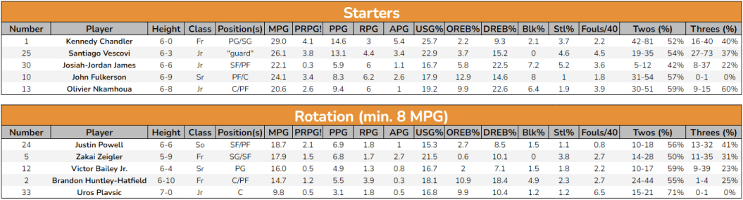 - Which team shortens their rotation first? Take a look at that starters + rotation graphic above for both sides. If we’re calling a rotation spot one that generates 8+ minutes per game, Memphis’s rotation is an absurd 11 players deep right now. Tennessee’s is still 10. An easy way to win an otherwise-tight game is to play your best players a lot of minutes.