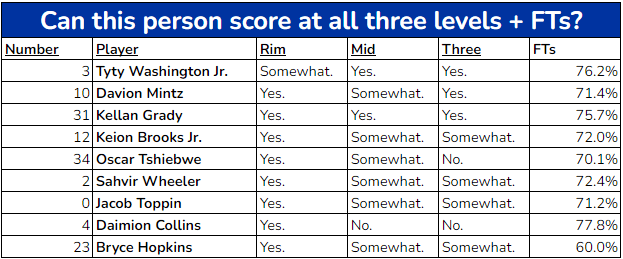 CHART! “Yes” means “is efficient at doing so”; “somewhat” means “can, but not efficiently”; “no” means “rarely or never.” SPECIAL NOTE: I’ve included free throw percentages here upon request. The numbers used are a player’s career FT%, not 2021-22.