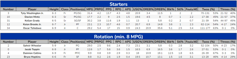 Metric explanations: MPG is minutes per game. PPG/RPG/APG/Fouls/Twos/Threes are what you’d guess. USG% is the percentage of possessions a player uses on the court. OREB%/DREB% are your available rebounds usurped. Finally, PRPG! is Bart Torvik’s Points Over Replacement metric; the higher the better. If you’re on mobile, zoom in; if on desktop, right click -> Open Image in New Tab.