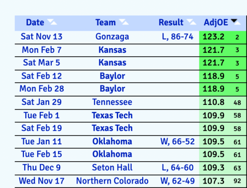 That graphic encapsulates every Top 100 offense on the Texas schedule. Something you’ll immediately notice: just four games against Top 100 competition, two of which were losses. Something else: Tennessee is the second-best offense Texas has played. Please think about this edition of Tennessee basketball and speak that out loud. Tennessee is the second-best offense Texas has played. God almighty.