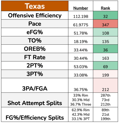 Beyond that, this is a Texas team that has some quality shooters but no lights-out shooter on it. All of Jones, Ramey, Carr, and Mitchell are threats in the mid-range and from deep, but you’re not drawing the Kellan Gradys of the world here. The best and most proven strategy with Texas has been to make them take a lot of jumpers in half-court offense. They’ll hit a decent amount, but it beats letting them get to the rim or the post. As crazy as this sounds, I think I’m fine with the mid-range jumpers. Here’s why: