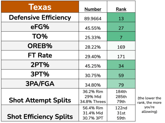 Interesting! This is the side that keeps Texas watchable: the Texas Tech defense with hand-picked transfer portal kings that forces a bonkers amount of turnovers and is excellent at forcing bad shots. The stats graphic spells it out pretty well: terrific at defending twos and threes, good at defending the rim, generally good all around. I like that. There is a problem, however: