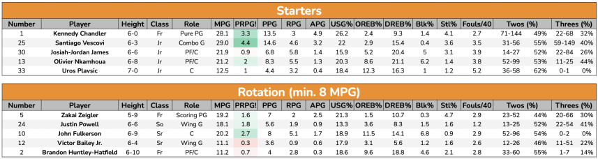 Metric explanations: Role is algorithmically-determined by Bart Torvik. MPG is minutes per game. PPG/RPG/APG/Fouls/Twos/Threes are what you’d guess. USG% is the percentage of possessions a player uses on the court. OREB%/DREB% are your available rebounds usurped. Finally, PRPG! is Bart Torvik’s Points Over Replacement metric; the higher the better. If you’re on mobile, zoom in; if on desktop, right click -> Open Image in New Tab.