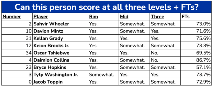 Wheeler is less known for his shooting/self-creation than what he opens up for everyone else on the team. Wheeler is lightning-fast and makes the offense play way faster; Kentucky spends almost 20% more time in transition when Wheeler’s on the court. Wheeler himself is an openly bad shooter – 9-for-34 from three, 18-for-74 mid-range – but he creates so many opportunities for everyone else that it generally doesn’t matter.