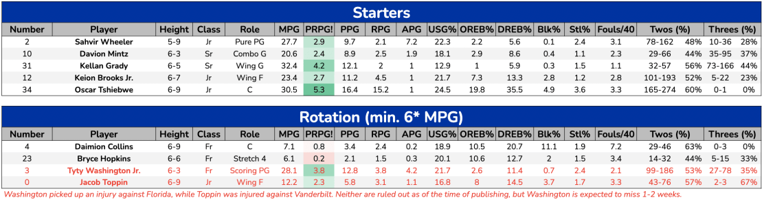 Metric explanations: Role is algorithmically-determined by Bart Torvik. MPG is minutes per game. PPG/RPG/APG/Fouls/Twos/Threes are what you’d guess. USG% is the percentage of possessions a player uses on the court. OREB%/DREB% are your available rebounds usurped. Finally, PRPG! is Bart Torvik’s Points Over Replacement metric; the higher the better. If you’re on mobile, zoom in; if on desktop, right click -> Open Image in New Tab.