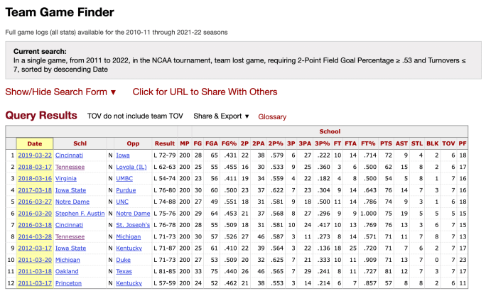 But that alone still wouldn’t explain what’s happened, starting in the Round of 32. Across the nine Tournaments directly preceding 2022, teams shot 1.1% better in the Round of 32 than they did in the Round of 64. This has a pretty simple explanation, to me: better teams are alive, and said teams are playing their second game in the arena of a weekend. You’re more familiar with your surroundings. That did not happen this year. In fact, it gave us the worst Round of 32 3PT% performance I can find on record.