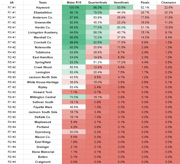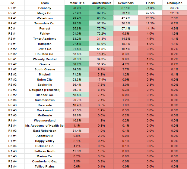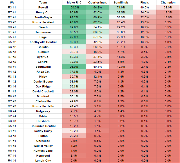 WHAT’S LEFT TO DO: There’s two games left, and SG is favored in both….but neither is a lock. Hampton this Friday features South Greene as a one-point favorite, while the season finale against Happy Valley has SG favored by 13. The odds of them winning both are, as shown above, about 41%. It’s more likely they finish 9-1 than 10-0, but it obviously wouldn’t be a stunner if they completed an undefeated season. If you’re curious, the team they’re most likely to play for their second-round game at home is……..Oneida.