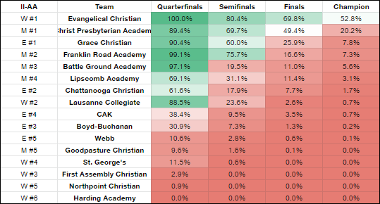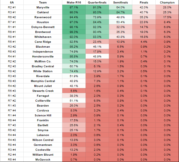 WHAT’S LEFT TO DO: A very easy win (Glencliff, Week 11) will come after two tough tests: Hendersonville at home this week (~18 point favorites) and a region-deciding battle with Beech (a literal tossup; Beech is favored by 0.07 points as I type) in Week 10.