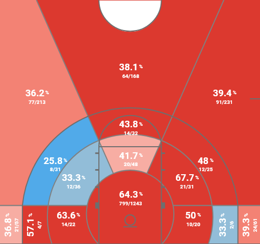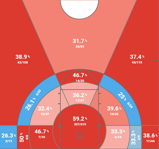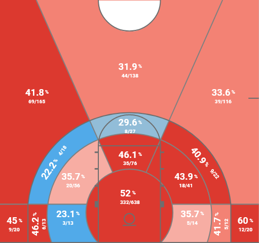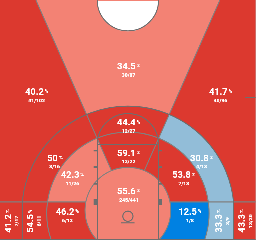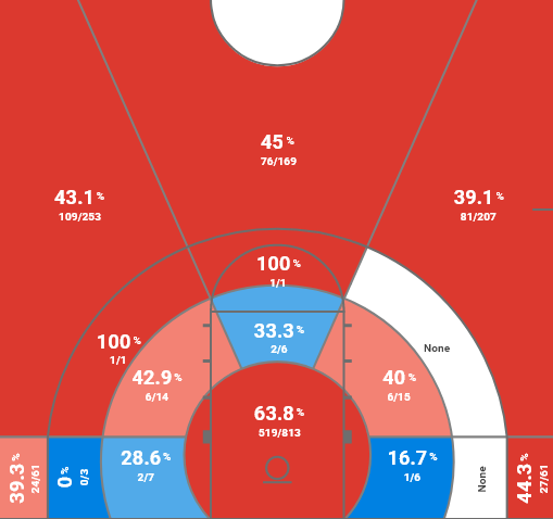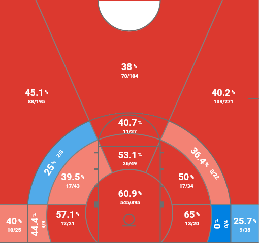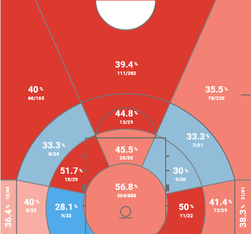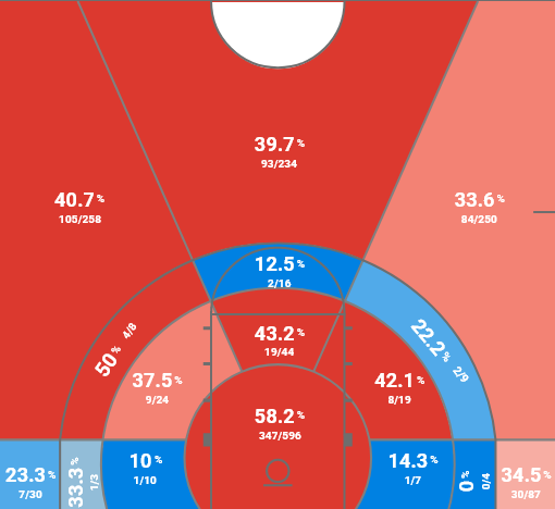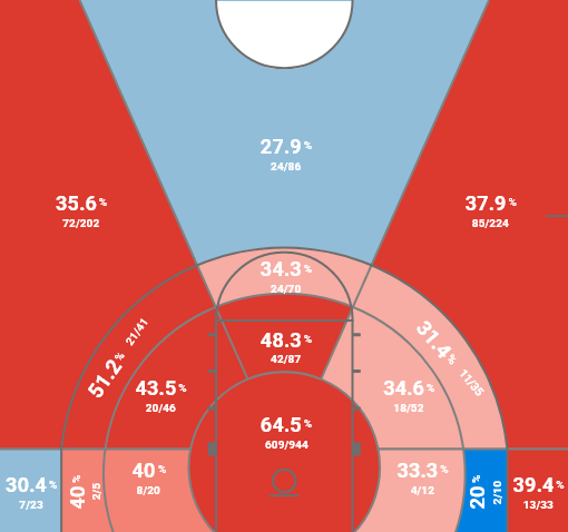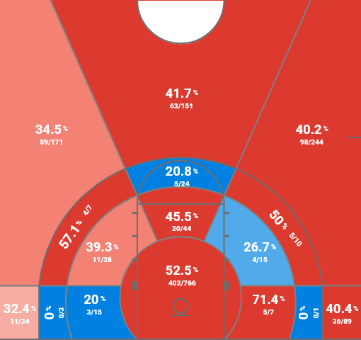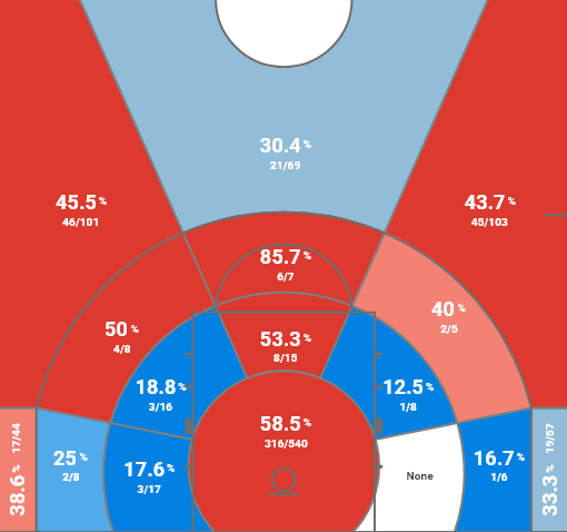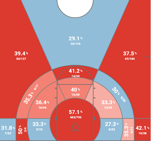 Tempo*0.5 + OE + eFG*1.5 – Mid*0.5 + Rim*0.5 + 3PT%*.75 + Block*0.5 + Steal*0.5 + 3PA*0.25 + Constant (currently 2.2, a completely arbitrary number to provide us with higher-rated teams)