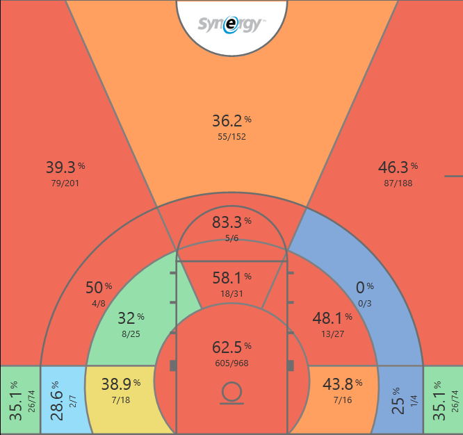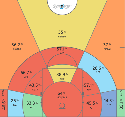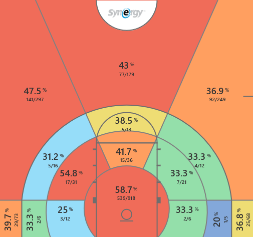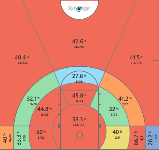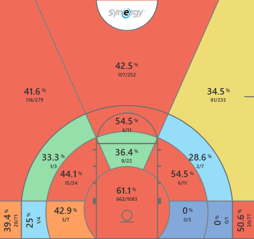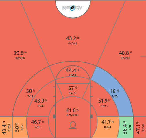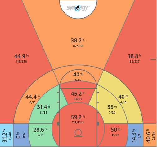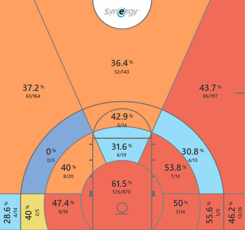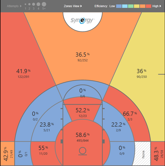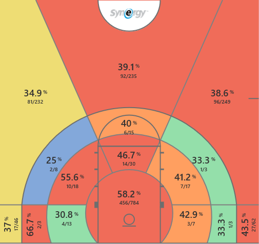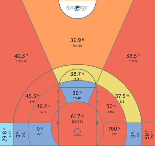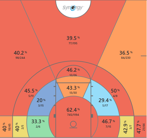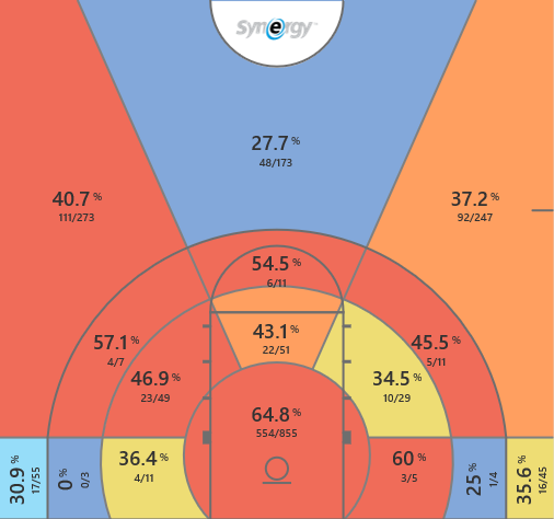 Tempo*0.5 + OE + eFG*1.5 – Mid*0.5 + Rim*0.5 + 3PT%*.75 + Block*0.5 + Steal*0.5 + 3PA*0.25 + Constant (currently 2.2, a completely arbitrary number to provide us with higher-rated teams)