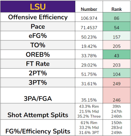 - Even the LSU slop was actually pretty successful on offense. Tennessee managed 64 points on 65 possessions (0.985 PPP), which looks bad on its face…but is also the highest PPP surrendered by LSU this season by a good margin. Torvik translates this to about a 1.23 PPP performance against an average defense, which is insane.