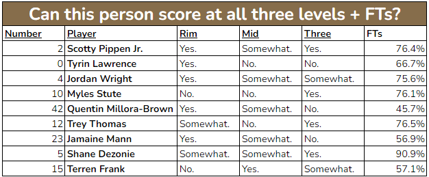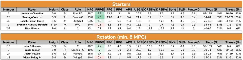 - The Chandler/Zeigler combo is questionably Tennessee’s secret sauce. I’m saying “questionably” because there are other factors. BUT: Tennessee’s offense, over the course of the season, is 5 points better per 100 when both are on the court versus one/neither. The biggest impact isn’t shooting but rather shot quality; Tennessee has a better rim-and-threes ratio, more assists, and is slightly better on twos.